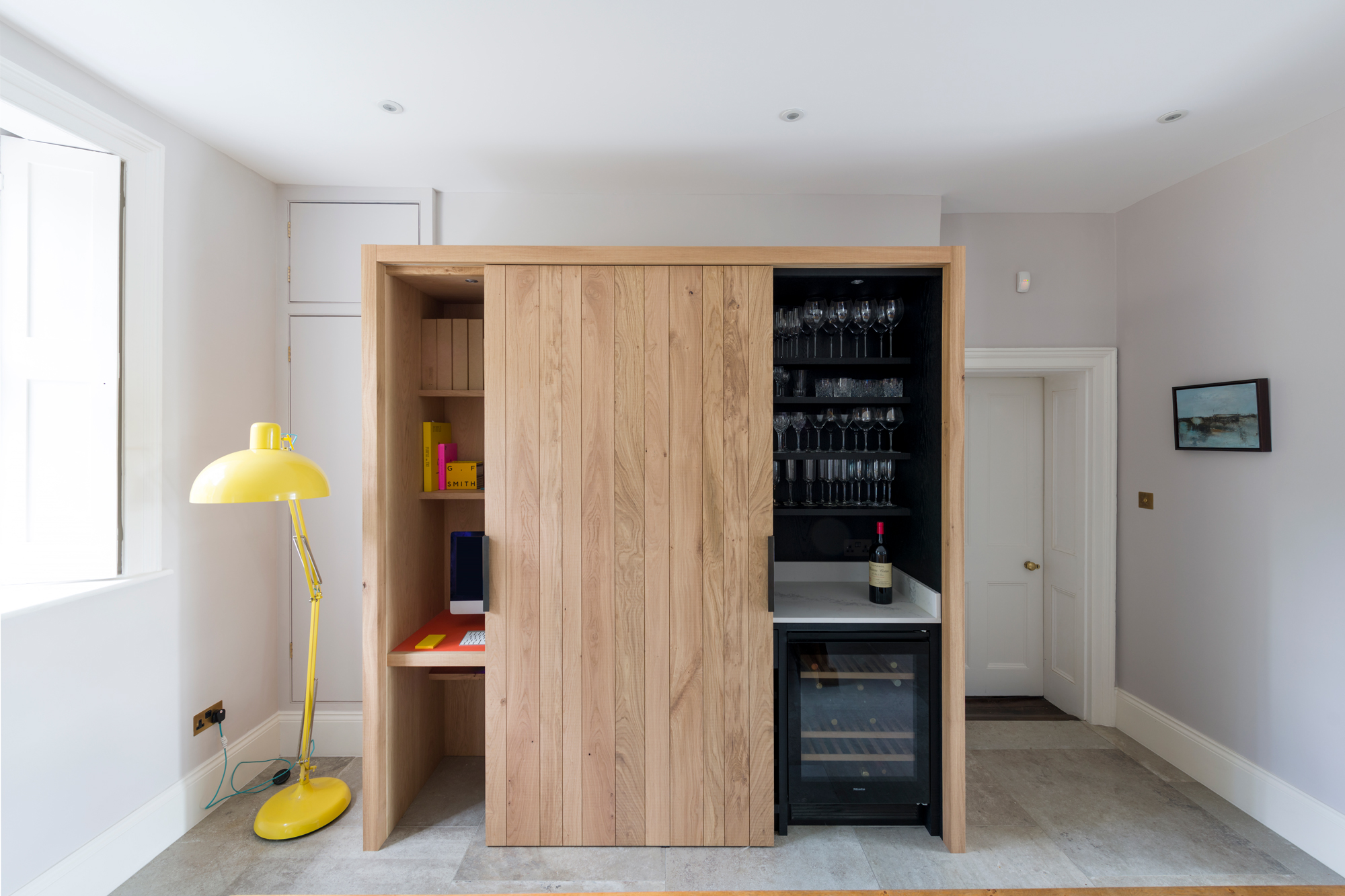 This is manifested in a gorgeous and ingenious cabinet that functions as both home office and, more importantly we would suggest, a seductive drinks station.