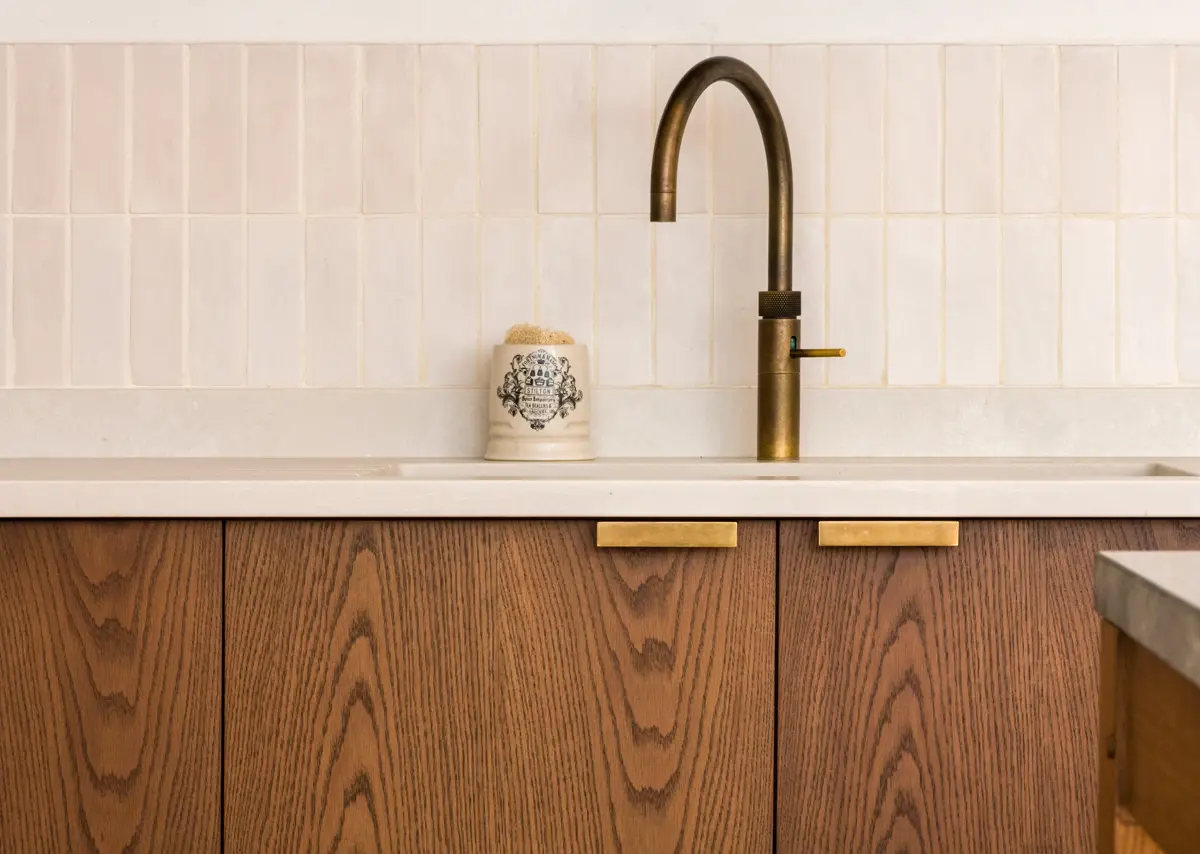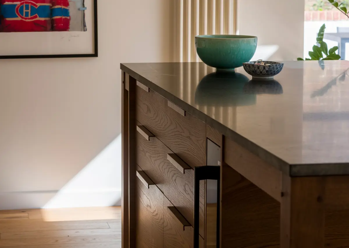 Joinery matters. Consistent 2 millimetre gap language so the whole reads as one composition. Flat-panel fronts for restraint. Solid island frame where structure needs to be felt. Handles placed by measurement and by hand, not by guess. Where the hand meets a corner, a softened arris. You feel the difference before you see it.