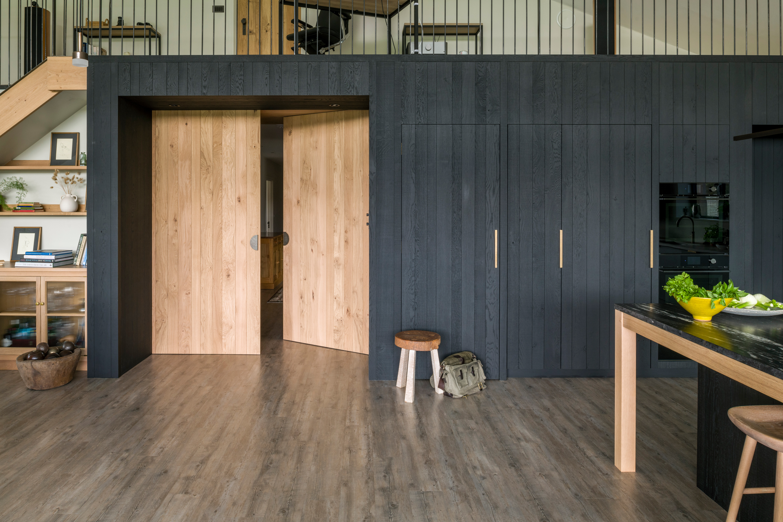 THE RAW OAK ON THE BLACKENED WALL CREATES AN ETHEREAL TUNNEL BETWEEN TWO WORLDS WHEN LEFT OPEN.