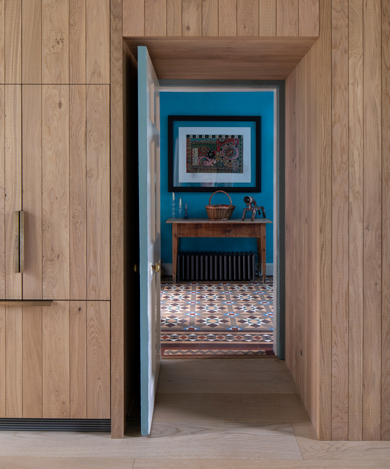 IH - This is a kitchen design where the materials do all the talking. A wall of our signature raw band-sawn oak cladding integrates with the existing architecture and neatly houses bulky appliances and the pantry at one end. It’s rough, organic texture sits comfortably here among the old and new of the building. Contrasted with smooth oak veneer cabinetry on the open-ended kitchen island, which grounds the space and has unrestricted views of the extension and gardens beyond.